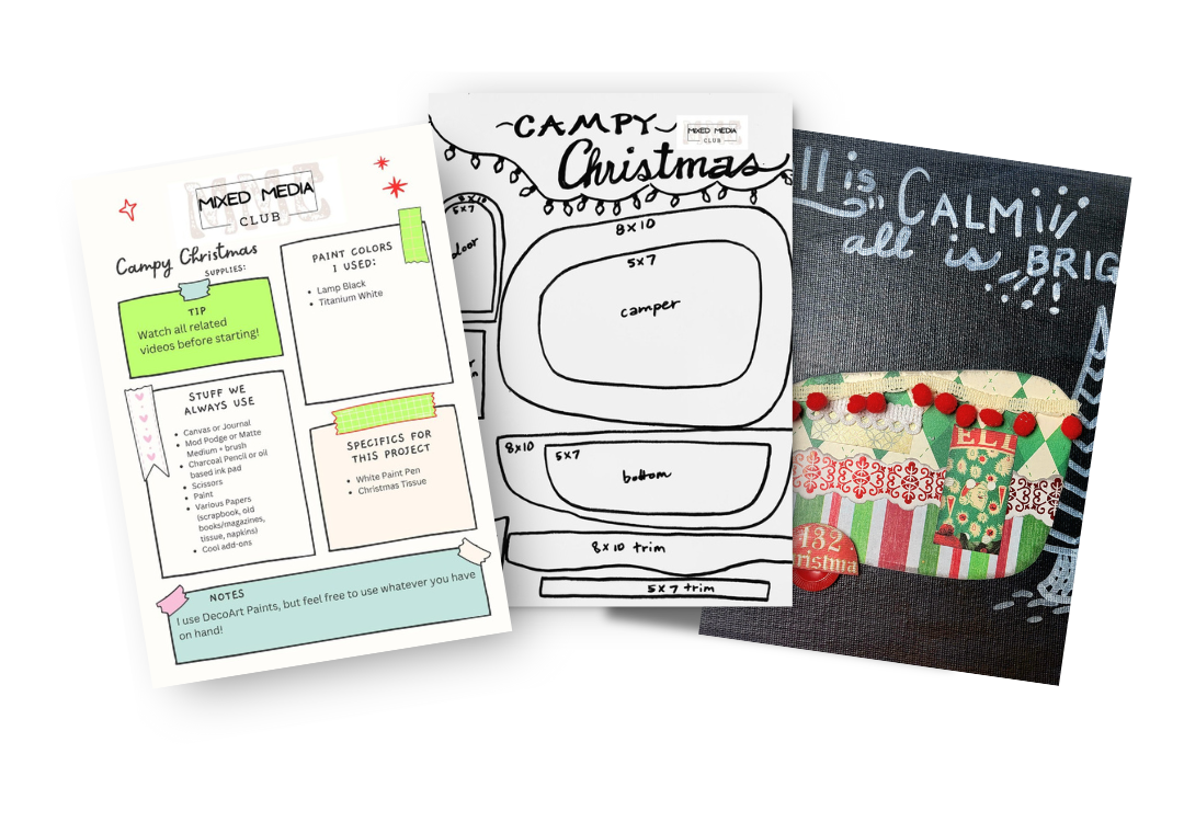 This bonus “Christmas in July” design celebrates a love for Camping, Chalkboard Art and all things Christmas! Chalkboard signs and art were a feature in our former art studio in Kitty Hawk where the Mixed Media Club was born! And, you guessed it, I couldn’t resist making a Campy Christmas Ornament!
